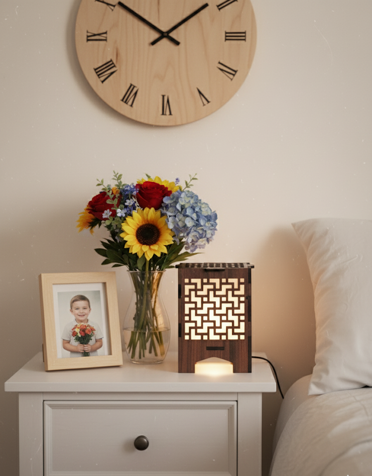 Assembly: Self Assembly Bulb Included: Yes Product Breadth: 11 cm Product Height: 11 cm Product Length: 11 cm Net Quantity (N): 1 Step 1: Start with Two Side Panels • Place the first two side panels upright. Align the edges carefully. Step 2: Insert the Bottom Panel • Slide the bottom panel into the holes on the two side panels. Step 3: Add the Remaining Side Panels • Insert the other two side panels into the holes on the bottom panel. Ensure all edges are aligned Step 4: Secure with the Top Panel • Place the top panel on the lamp to tighten the structure. Step 5: Your lamp is now ready to light up and enjoy! Package Contains: • 3 Lamps (Small, Medium, Large) • 3 Power Cords (pre-attached) • 3 COB LED (Warm White) • Premium wood with elegant design • Self-locking mechanism requires no glue • Complete set of 3 sizes • Festive and Everyday use • Lightweight & Portable Country of Origin: India