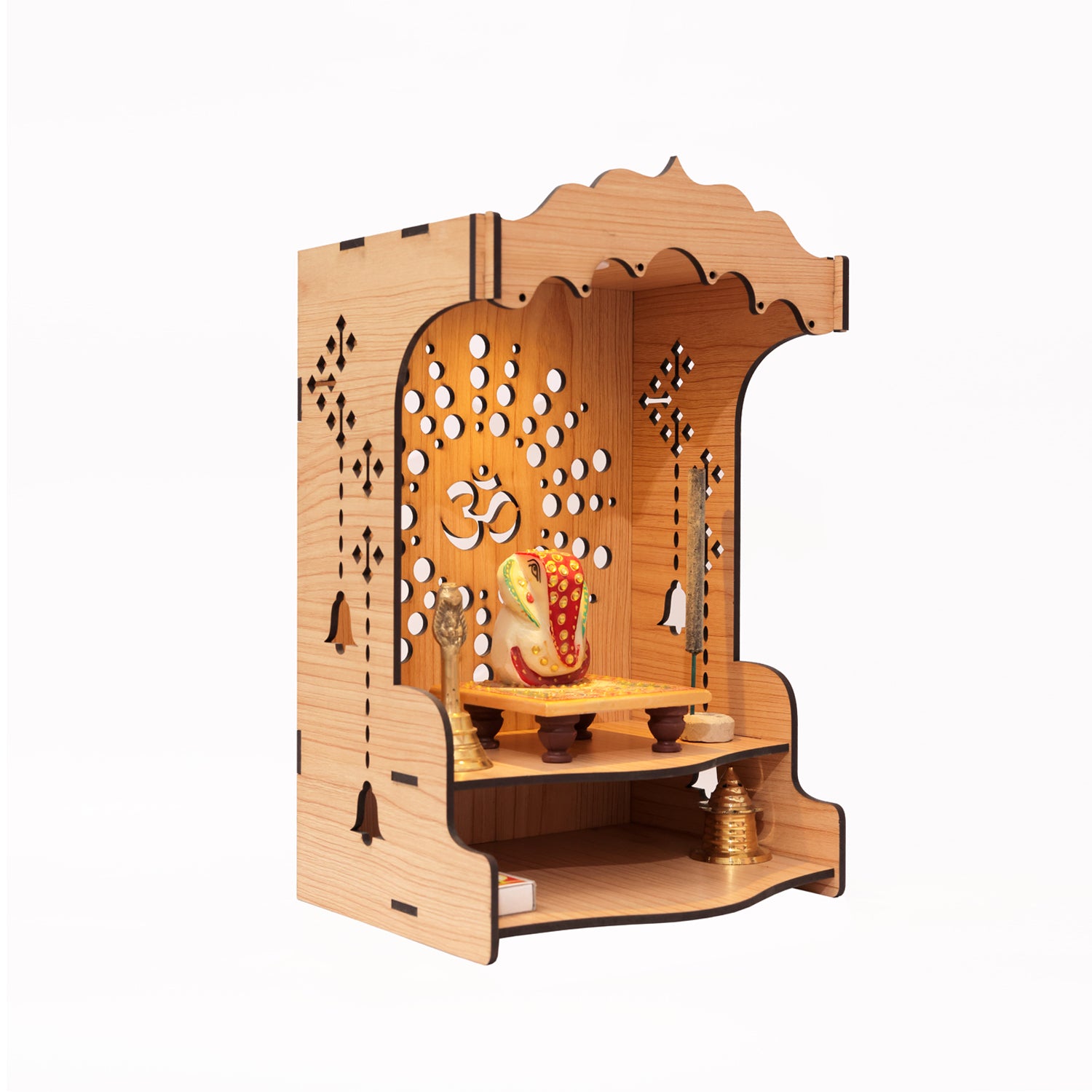 The Shanti Mandir by Real Wood Art is a handcrafted wooden pooja temple with intricate laser-cut detailing and smooth finish.